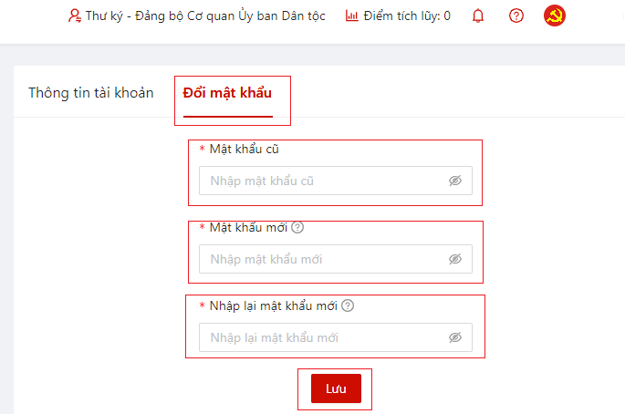 Bước 4. Để thay đổi mật khẩu, chọn "Đổi mật khẩu": "Mật khẩu cũ" nhập mật khẩu được gửi về email, sau đó nhập 02 lần mật khẩu mới (Độ dài tối thiểu của mật khẩu mới là 8, phải có ít nhất 1 ký tự hoa, 1 ký tự thường, 1 ký tự đặc biệt và 1 chữ số.) vào các ô "Mật khẩu mới" và chọn "Lưu".