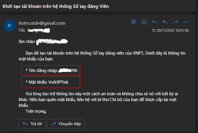 Email thông báo "Khởi tạo tài khoản trên hệ thống Sổ tay đảng Viên"