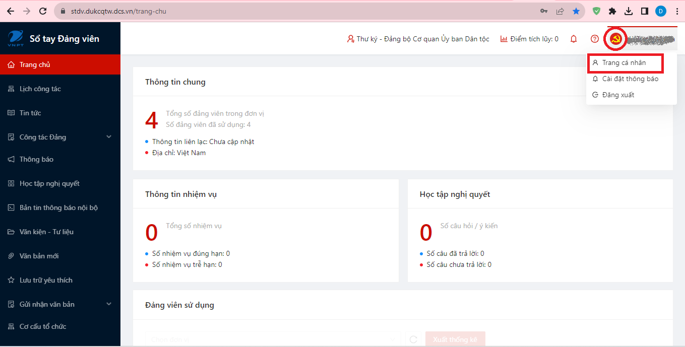 Bước 3. Click vào biểu tượng cờ Đảng ở góc phải màn hình và chọn "Trang cá nhân"
